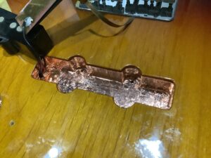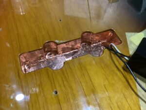 1990年代製のジャパンフェンダーですが、コントロールキャビティ、ピックアップキャビティとも底面にこそシールドの銅プレートがあるのですが、側面には何の対策もされておらずガラ空きです。なぜか1960年代製のビンテージジャズベースも同じ構造となっており、そのままデッドコピーしたと推測されます。導電塗料よりも輻射ノイズの表面伝導性に優れるとされる、銅テープで密閉しました。使用されるプロにリハーサルスタジオ環境でチェックして頂いたところ、ノイズは使用上問題無いレベルまで低減でき、ハイ落ちの副作用も気になりませんでした。