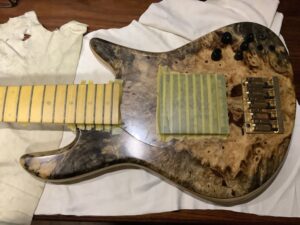 演奏の現場で何年か使用された状態ですが、楽器の作りが非常にしっかりしており、ネック、ボディ、回路等ハードウェアも大きな異常はありませんでした。フレット、指板の弾きこみによる消耗を研磨&クリーンアップしブリッジ等の狂いを調整しましたが、ハイエンドの多弦ベースならではのスケール長、またピッキングの演奏性を向上させるフィンガーランプも取付けられており、デフォルトの弦高設定もシビアでしたが、ご満足頂ける調整に仕上がりました。